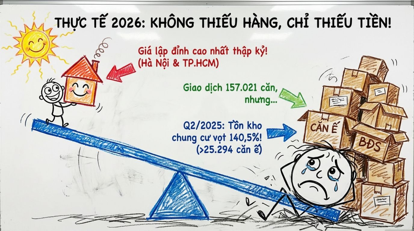 Báo cáo công bố gần nhất của cơ quan quản lý cho thấy trong quý II/2025, tổng lượng giao dịch bất động sản đạt khoảng 157.021 giao dịch, nhưng tồn kho tại các dự án vẫn ở mức trên 25.294 căn/nền và còn tăng nhẹ so với quý trước; riêng chung cư tồn kho bằng khoảng 140,5% so với quý I/2025. Cùng lúc, giá căn hộ bình quân tại Hà Nội và TP.HCM đã lên mức cao nhất trong gần một thập kỷ. Điều đó cho thấy thị trường không thiếu giao dịch, nhưng không phải mọi mức giá đều phản ánh đúng nhu cầu ở thật.