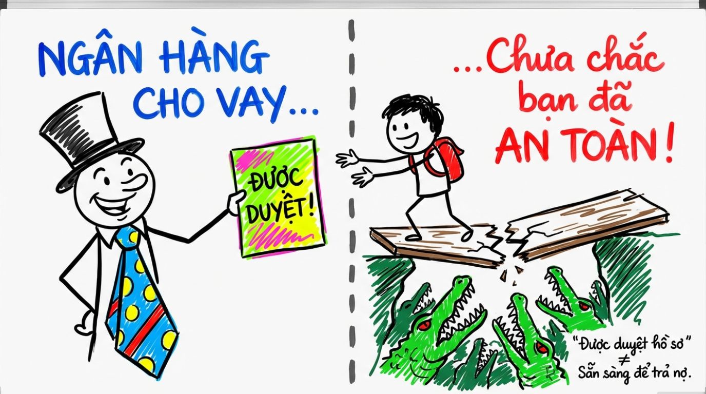 Nếu sau khi đặt cọc, công chứng, nộp thuế phí, hoàn thiện nội thất cơ bản và dọn vào ở mà tài khoản của bạn gần như về 0, bạn chưa ở vị thế tốt để vay. Khi đó, chỉ cần một biến cố vừa phải như thu nhập chậm về, chi phí y tế, việc học của con hoặc chi phí sửa chữa phát sinh, bạn sẽ phải xoay bằng thẻ tín dụng, vay ngắn hạn hoặc rút vốn kinh doanh. Một khoản mua nhà trả góp chỉ an toàn khi sau khi mua xong, bạn vẫn còn khoảng thở cho đời sống thường ngày. Quan điểm này không phải ngưỡng pháp lý bắt buộc, mà là nguyên tắc quản trị rủi ro suy ra trực tiếp từ nghĩa vụ trả nợ kéo dài.