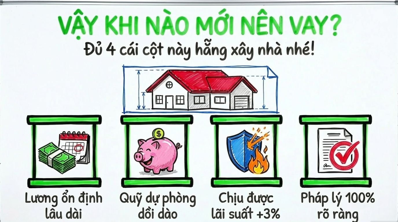 Bạn có thể bắt đầu cân nhắc nghiêm túc khi đáp ứng được 4 điều kiện nền tảng sau: thu nhập chính đủ ổn định để chứng minh với ngân hàng; sau khi mua vẫn còn quỹ đệm tiền mặt; lịch trả nợ vẫn chịu được ở kịch bản lãi suất kém thuận lợi hơn; và hồ sơ pháp lý của tài sản đã được rà soát đến nơi đến chốn. Đây là cách tiếp cận an toàn hơn nhiều so với việc chỉ nhìn vào câu hỏi “ngân hàng cho vay bao nhiêu”.