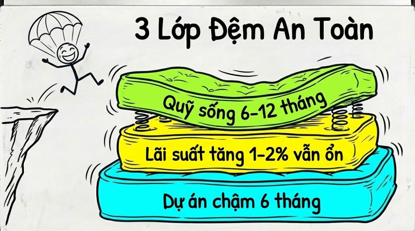 Hãy chỉ vay khi đã có ba lớp đệm. Lớp thứ nhất là quỹ sinh hoạt hoặc chi phí vận hành tối thiểu 6-12 tháng. Lớp thứ hai là kịch bản lãi vay tăng thêm 1-2 điểm phần trăm mà vẫn trả được. Lớp thứ ba là kịch bản tài sản chậm tạo dòng tiền hoặc chậm sang nhượng hơn kế hoạch ít nhất 6 tháng. Nếu thiếu một trong ba lớp này, nên xem lại quy mô thương vụ thay vì cố “gồng” bằng niềm tin.