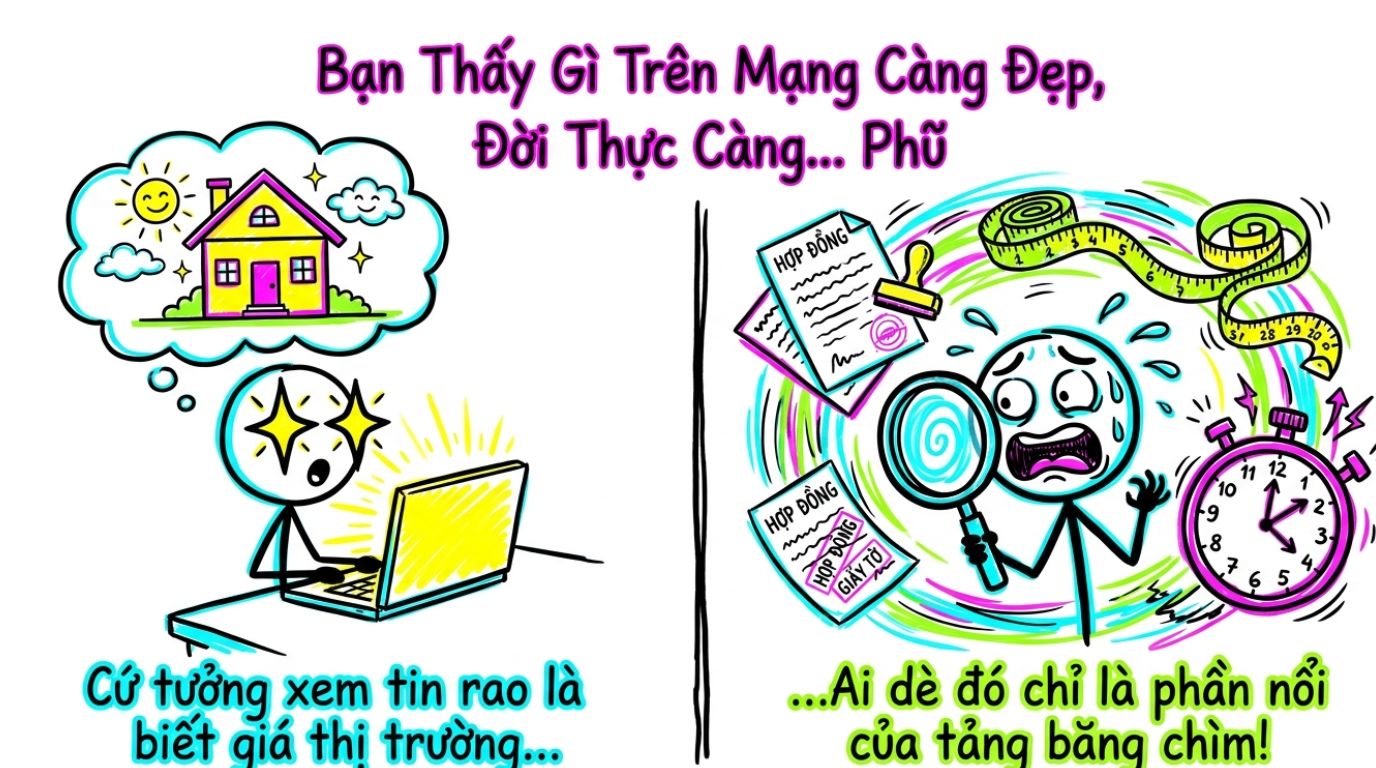 Giá chào bán dễ nhìn thấy nhưng chưa chắc đã được thị trường chấp nhận. Giá giao dịch thực tế khó thu thập hơn, nhưng giá trị tham chiếu cao hơn vì gắn với một thương vụ cụ thể. Trong bối cảnh cần Phân biệt giá trị thật và giá ảo, người mua không nên chỉ lấy 3–5 tin rao rồi cộng trung bình để định giá tài sản.