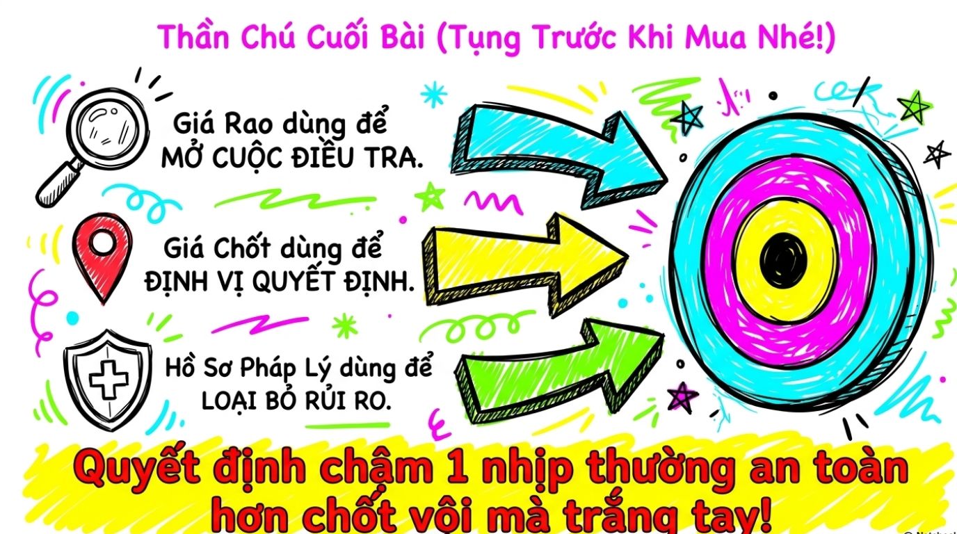 Nếu phải chọn một nguyên tắc ngắn gọn, hãy nhớ: giá rao dùng để mở cuộc kiểm tra, giá chốt dùng để định vị quyết định, còn hồ sơ pháp lý dùng để loại bỏ rủi ro.