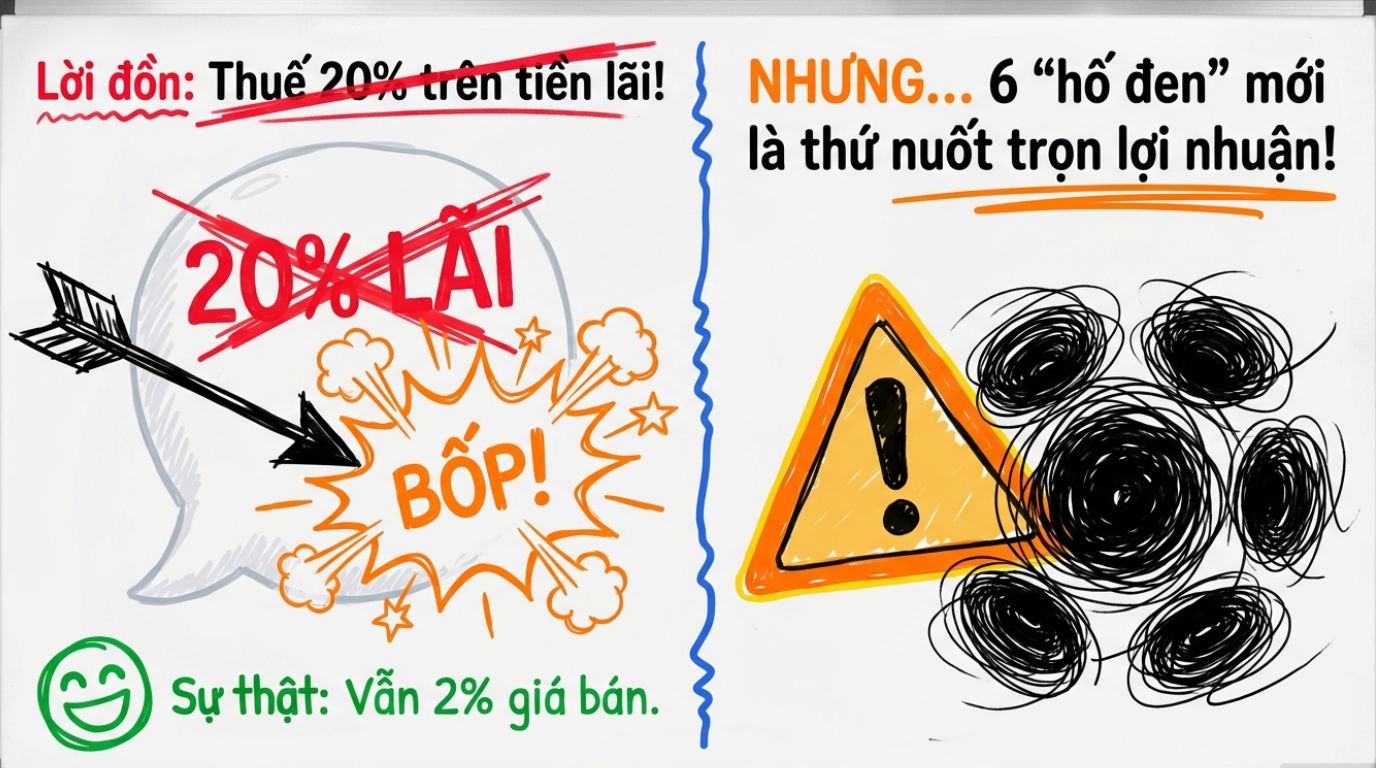 Ở góc nhìn đầu tư, hiểu rõ rủi ro đầu tư không còn dừng ở pháp lý dự án hay khả năng tăng giá. Người mua còn phải tách riêng dòng tiền trước thuế và sau thuế, rồi mới đánh giá thương vụ có thật sự hiệu quả hay không. Chỉ một giả định sai về VAT, TNCN, TNDN hay lệ phí trước bạ cũng đủ làm lệch lợi suất, kéo điểm hòa vốn đi xa hơn và khiến bạn nhầm giữa lợi nhuận danh nghĩa với lợi nhuận thật.