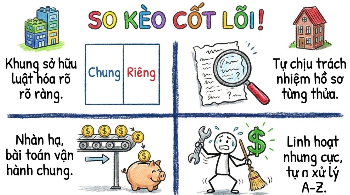 Nếu ưu tiên cấu trúc sở hữu rõ ràng, chung cư có lợi thế ở việc luật quy định khá cụ thể phần nào là riêng, phần nào là chung. Ngược lại, nhà phố có lợi thế ở chỗ gắn với thửa đất riêng, nhưng càng vì vậy người mua càng phải tự chịu trách nhiệm nhiều hơn trong việc kiểm tra ranh đất, hiện trạng xây dựng, giấy phép và sự phù hợp quy hoạch. Nói ngắn gọn: chung cư rõ ở “khung sở hữu”, còn nhà phố đòi hỏi rõ ở “hồ sơ từng thửa”.